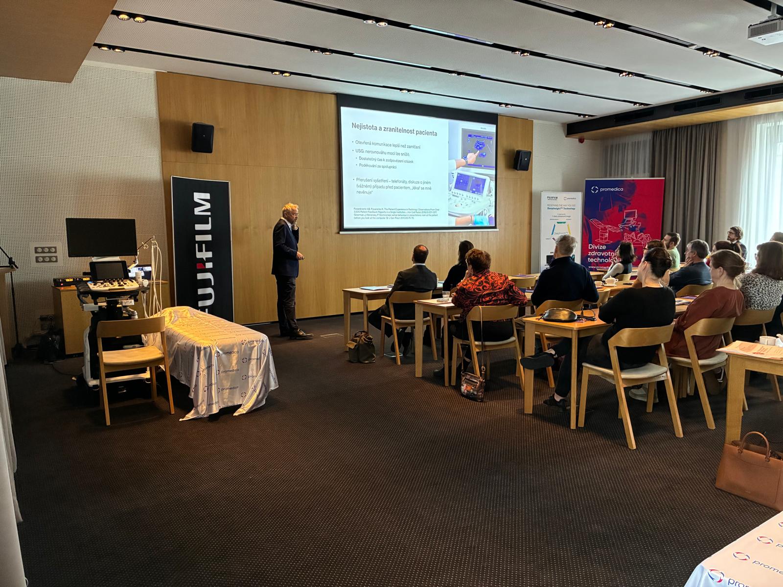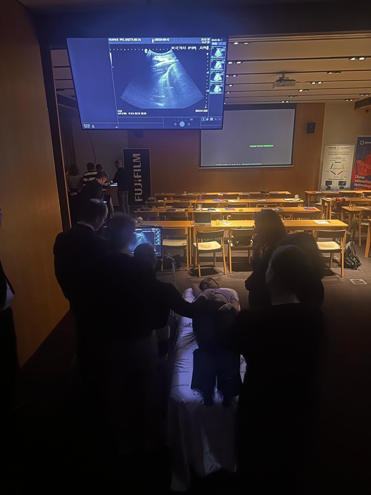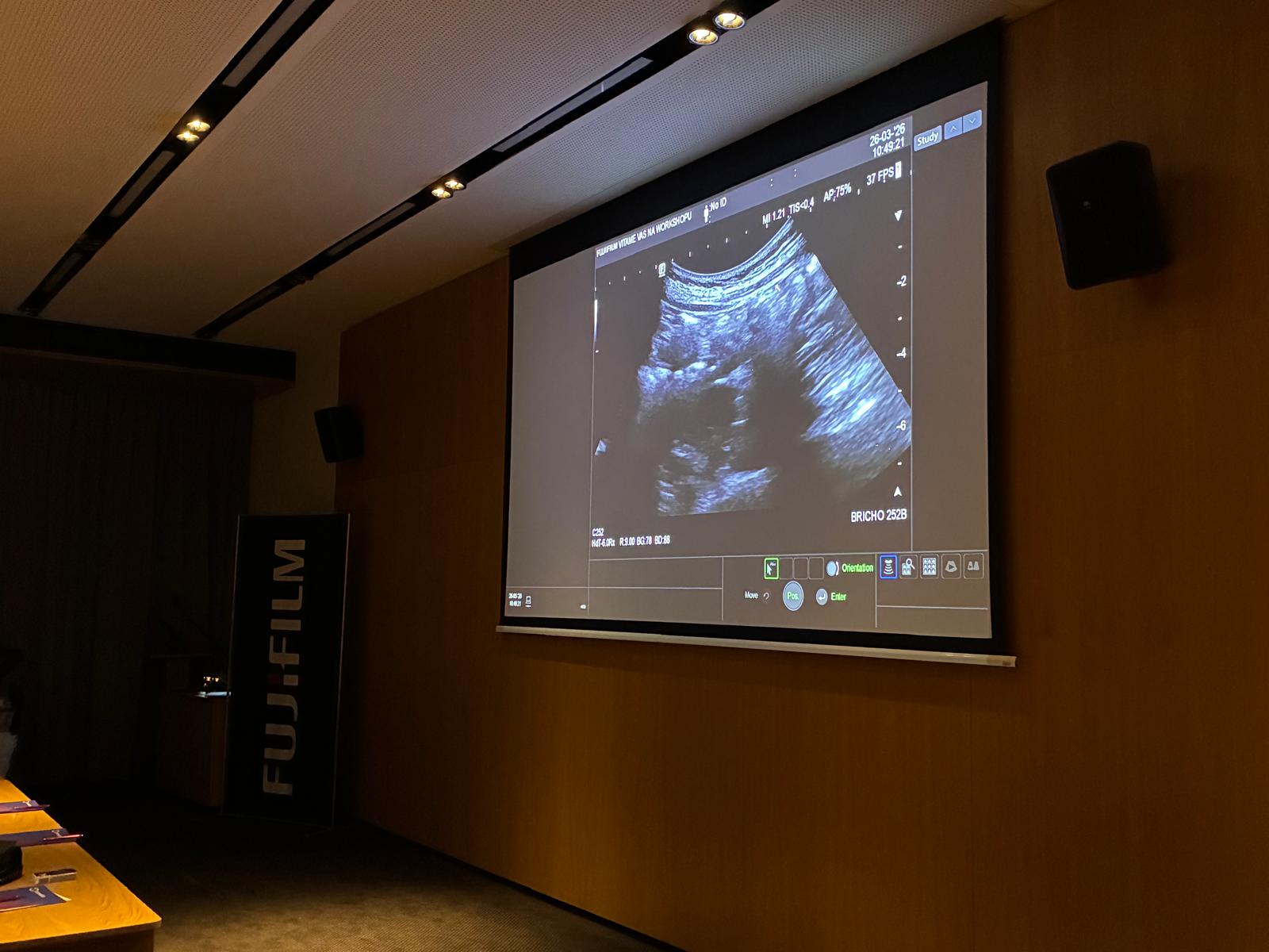 Po teoretickém bloku a krátkém občerstvení byl pro účastníky připraven odpolední praktický workshop na našich třech ultrazvukových přístrojích nového typu FUJIFILM Arietta 850 DIX a FUJIFILM Arietta 750 DIX, během kterého si účastníci mohli vyzkoušet oba typy elastografie, jak ShearWave, tak RealTime elastografii a dále vyšetření střev.