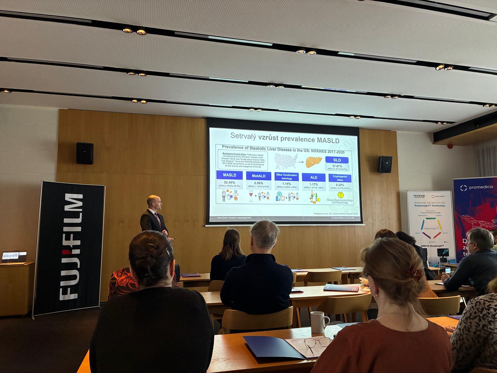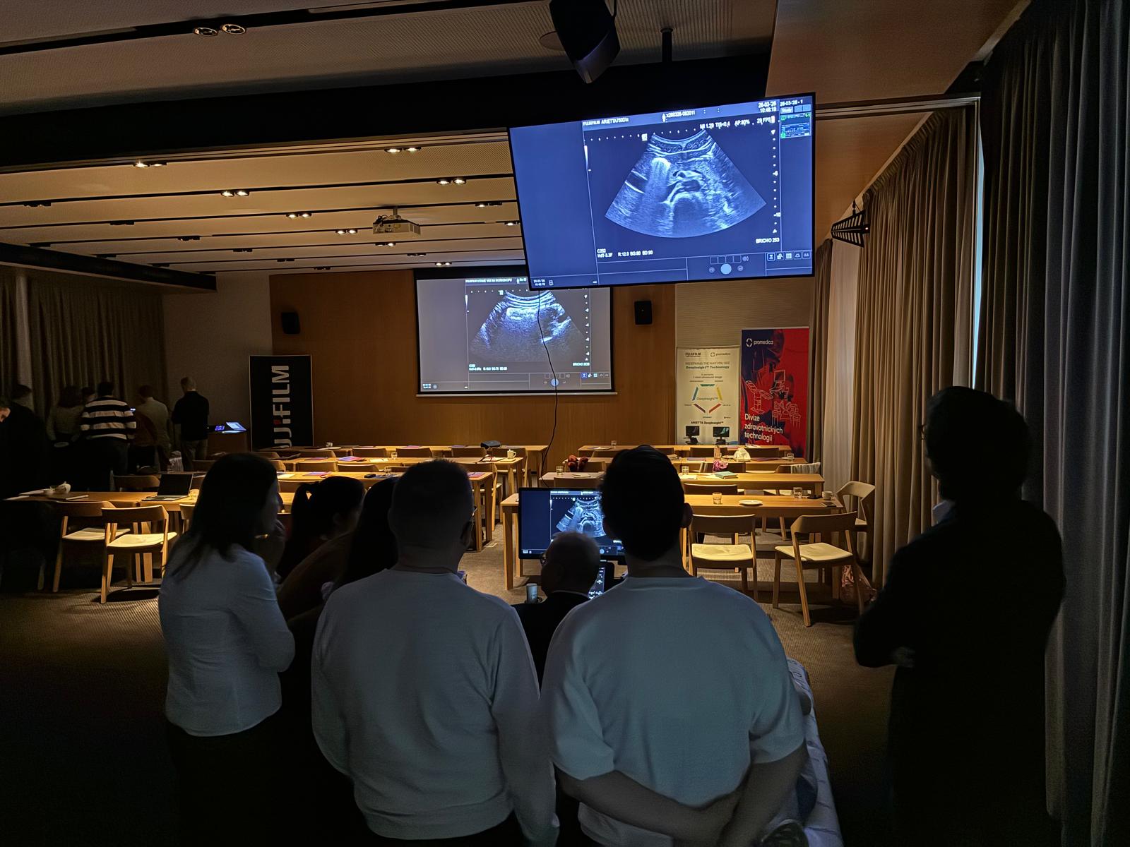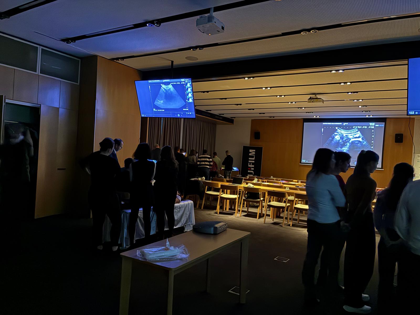 Po teoretickém bloku a krátkém občerstvení byl pro účastníky připraven odpolední praktický workshop na našich třech ultrazvukových přístrojích nového typu FUJIFILM Arietta 850 DIX a FUJIFILM Arietta 750 DIX, během kterého si účastníci mohli vyzkoušet oba typy elastografie, jak ShearWave, tak RealTime elastografii a dále vyšetření střev.